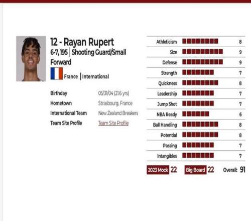 我放上他当初的选秀报告,NBA draft 网站选秀综合评分91分,预计选秀顺位首轮21-22顺位(实际次轮总第43顺位被选中),在Size尺寸和Defense防守方面评分9分非常出色,在NBA Ready准备方面6分非常不足,选秀模板OG阿奴诺比,网站评语如下: