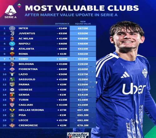 北京时间12月23日,在更新了意甲球员的身价之后,德转列出了意甲俱乐部的总身价排名,此次更新后国际米兰全队的身价下跌了2400万欧元,不过他们依然以6.7亿欧元的高居第一,尤文图斯5.5亿欧元第二,AC米兰4.86亿欧元第三,那不勒斯4.64亿欧元第四。