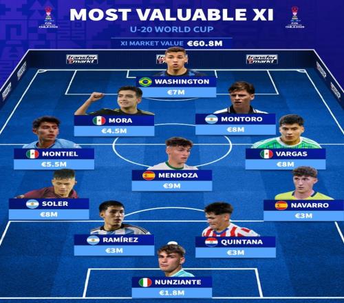 本届U20世界杯最贵阵容:最高仅900万,切尔西前锋华盛顿在列